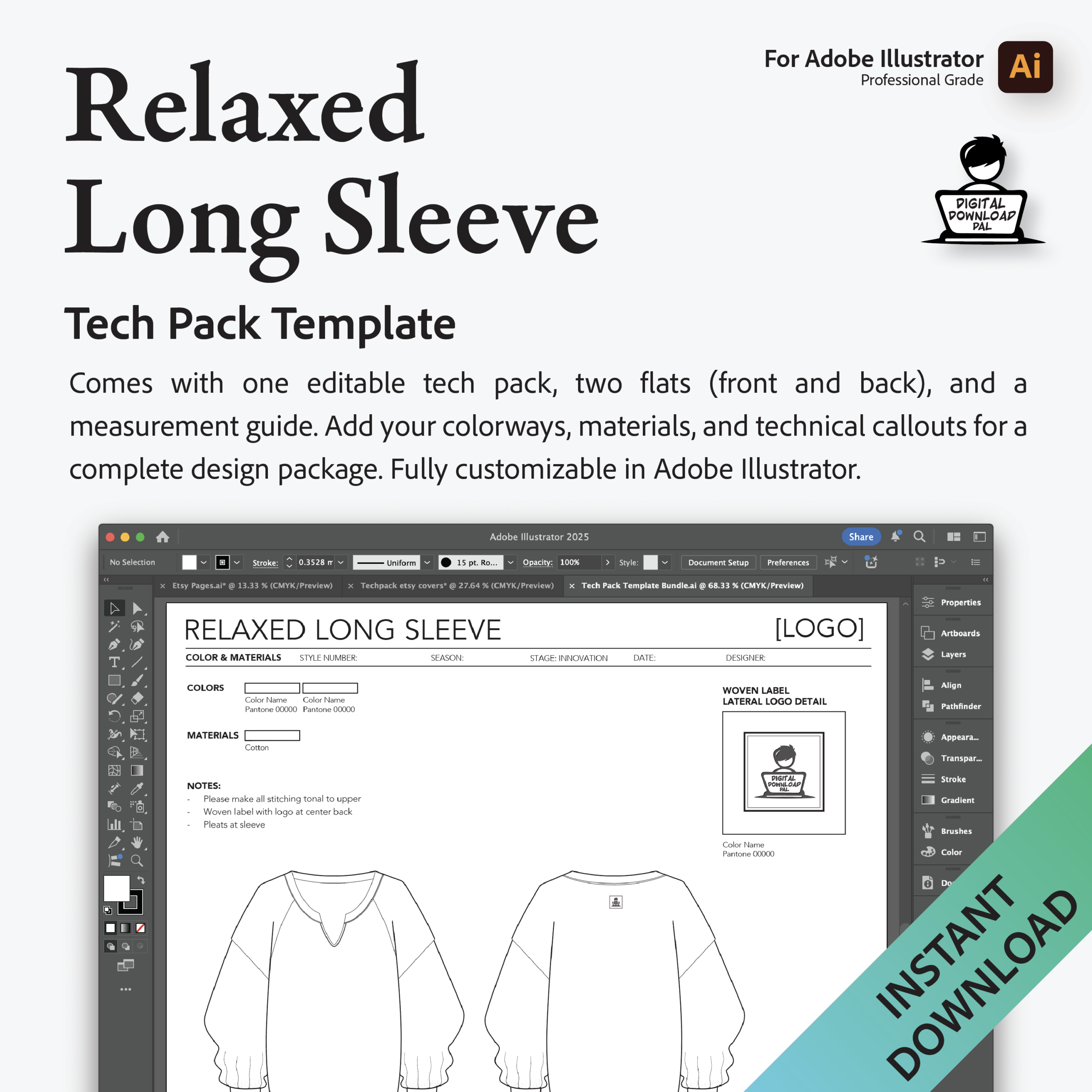 • Comprehensive: This tech pack includes everything you need to create a fully functional and professional tech pack, from detailed flats to specs.